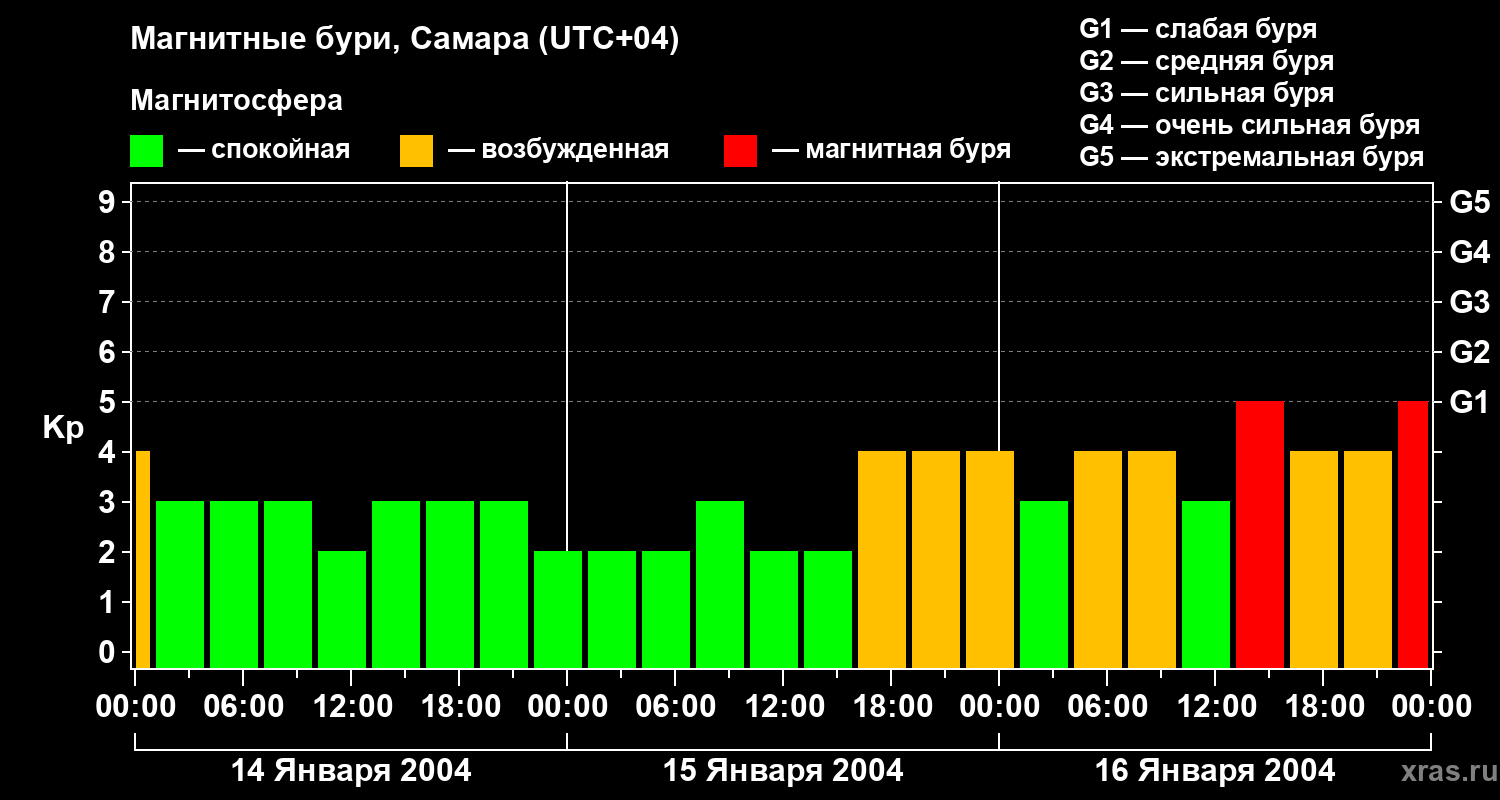 Изменения геомагнитного индекса Kp с 14 по 16 января 2004 года для средних широт