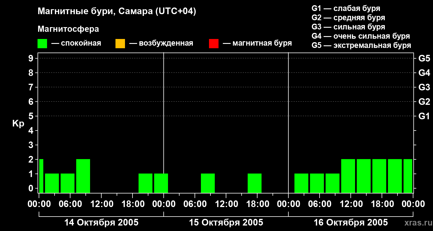 Изменения геомагнитного индекса Kp с 14 по 16 октября 2005 года для средних широт