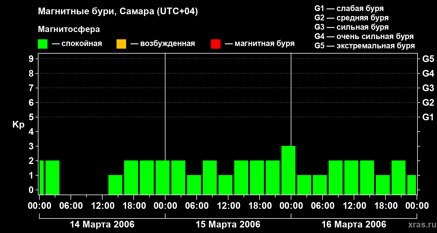 Изменения геомагнитного индекса Kp с 14 по 16 марта 2006 года для средних широт