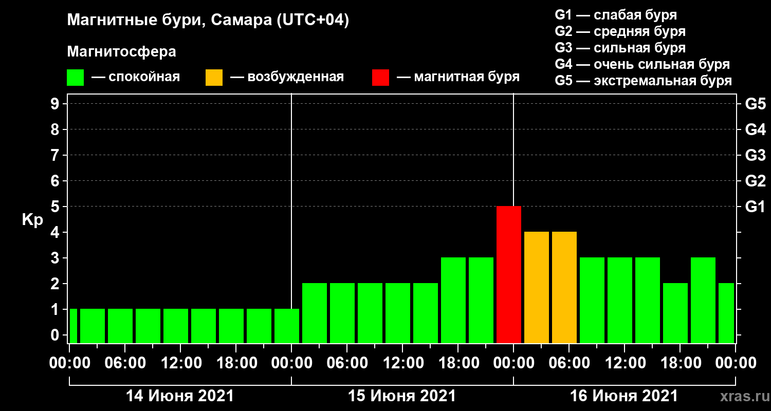 Изменения геомагнитного индекса Kp с 14 по 16 июня 2021 года для средних широт