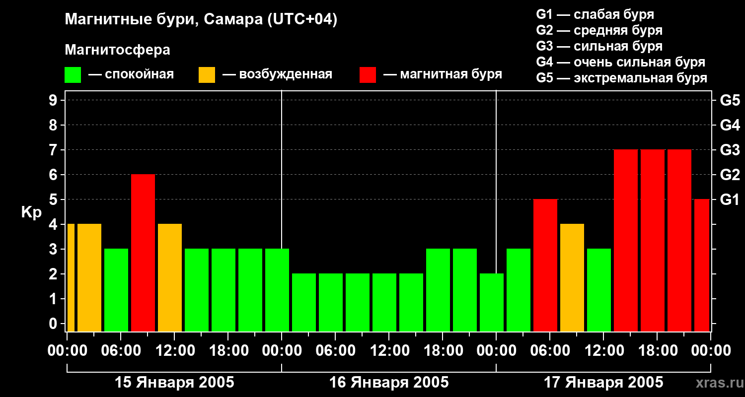 Изменения геомагнитного индекса Kp с 15 по 17 января 2005 года для средних широт