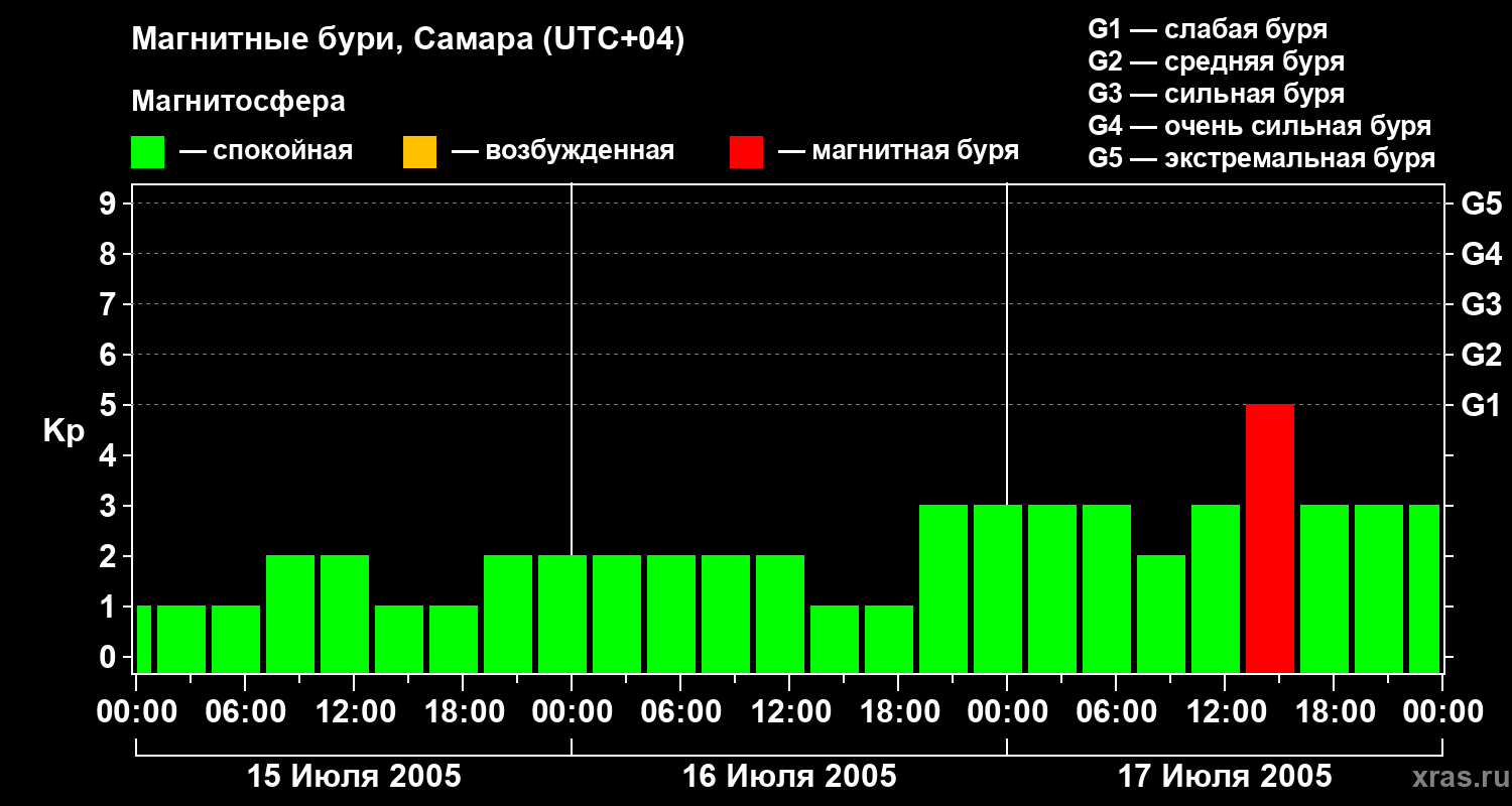 Изменения геомагнитного индекса Kp с 15 по 17 июля 2005 года для средних широт