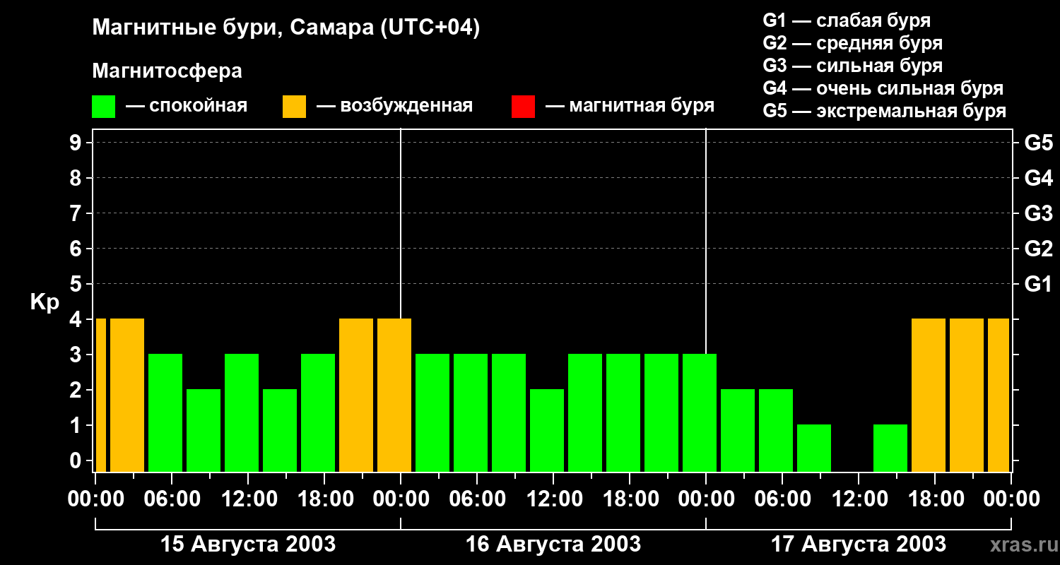 Изменения геомагнитного индекса Kp с 15 по 17 августа 2003 года для средних широт