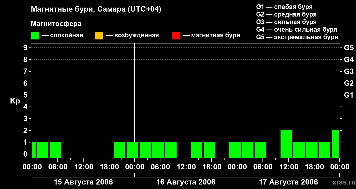 Изменения геомагнитного индекса Kp с 15 по 17 августа 2006 года для средних широт
