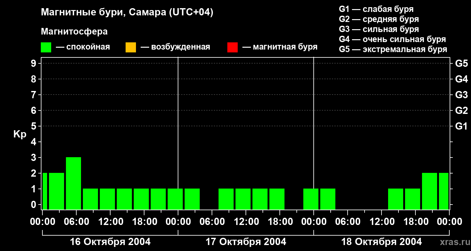 Изменения геомагнитного индекса Kp с 16 по 18 октября 2004 года для средних широт