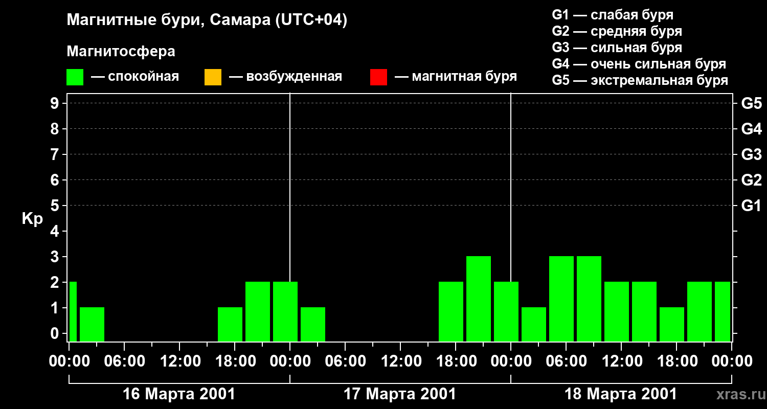 Изменения геомагнитного индекса Kp с 16 по 18 марта 2001 года для средних широт