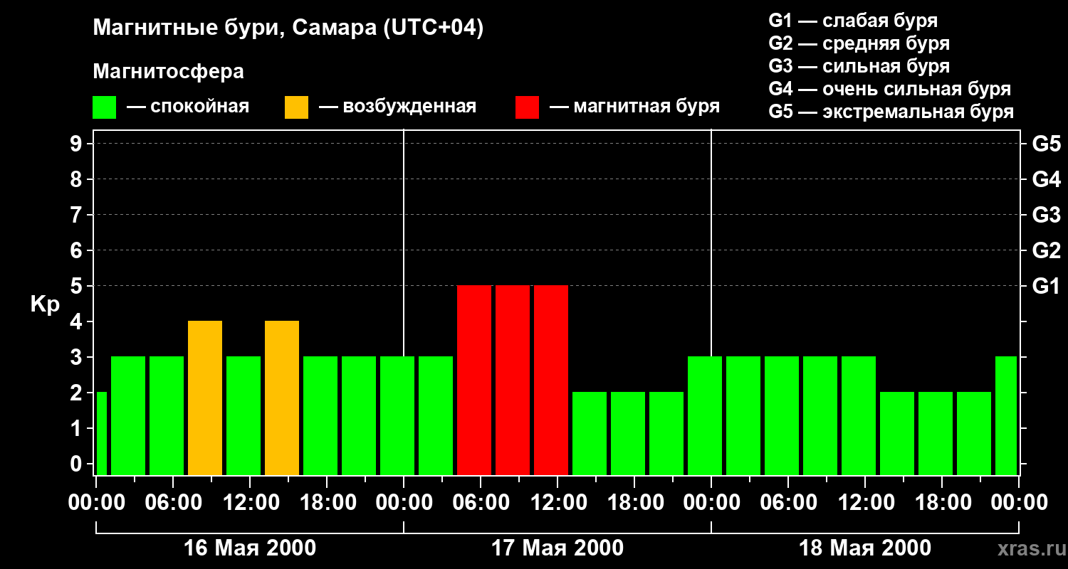 Изменения геомагнитного индекса Kp с 16 по 18 мая 2000 года для средних широт
