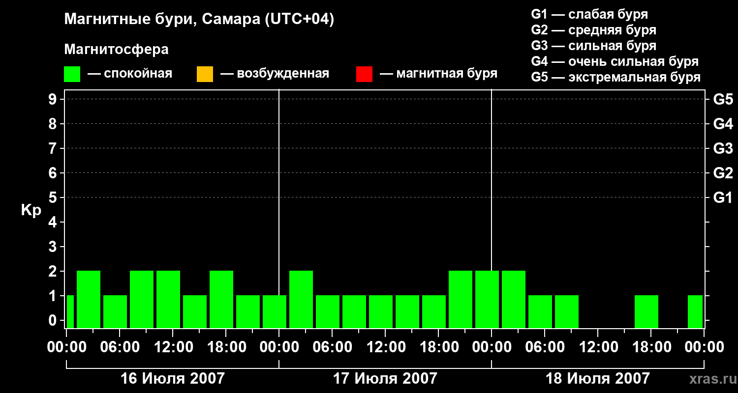 Изменения геомагнитного индекса Kp с 16 по 18 июля 2007 года для средних широт