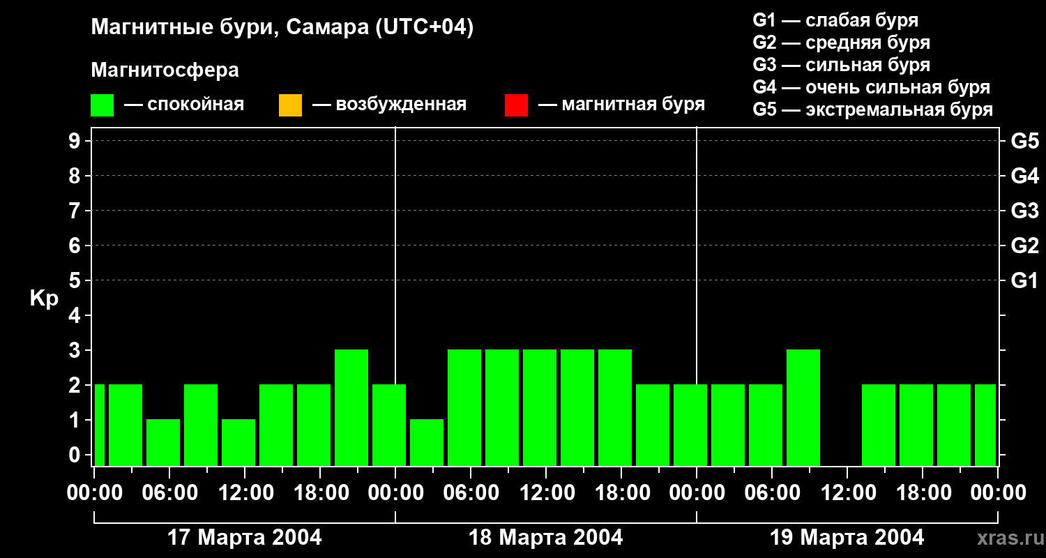 Изменения геомагнитного индекса Kp с 17 по 19 марта 2004 года для средних широт