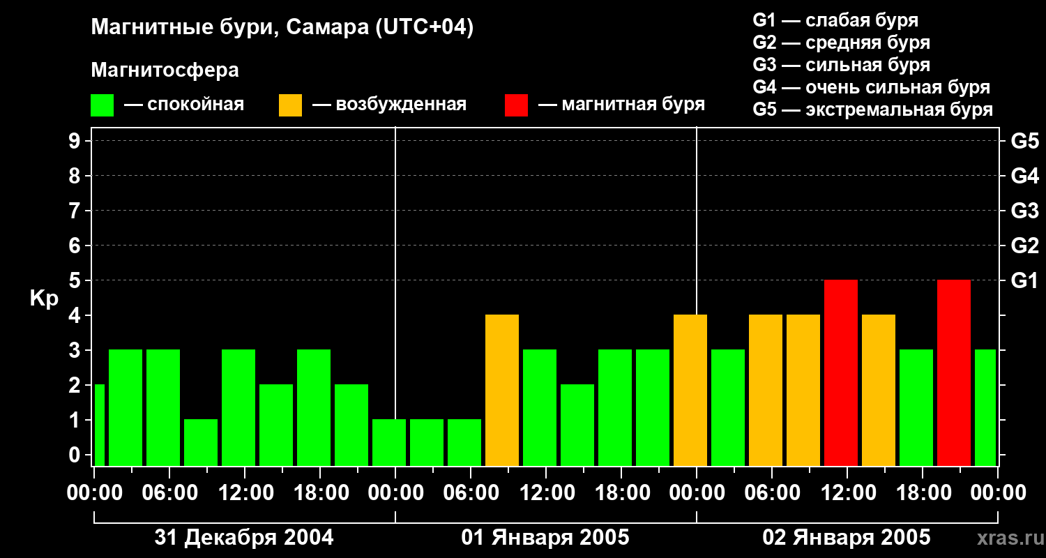 Изменения геомагнитного индекса Kp с 31 декабря 2004 года по 2 января 2005 года для средних широт