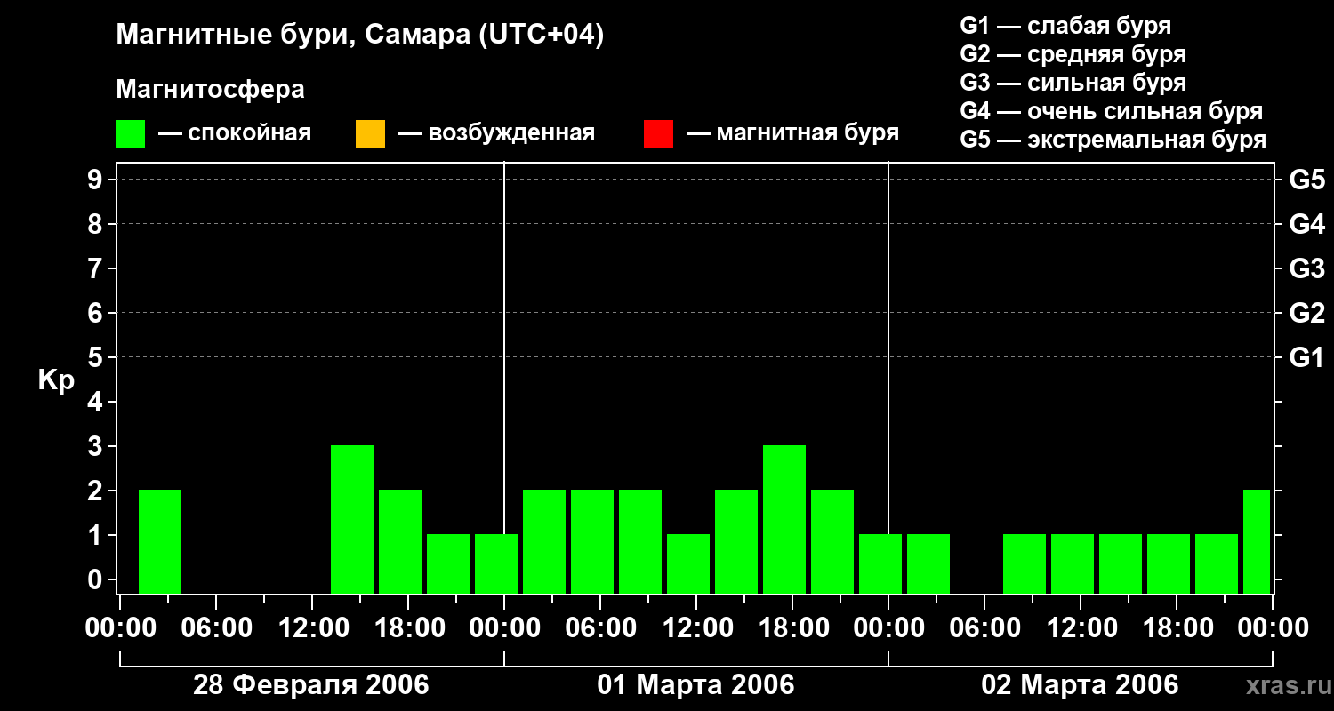 Изменения геомагнитного индекса Kp с 28 февраля по 2 марта 2006 года для средних широт