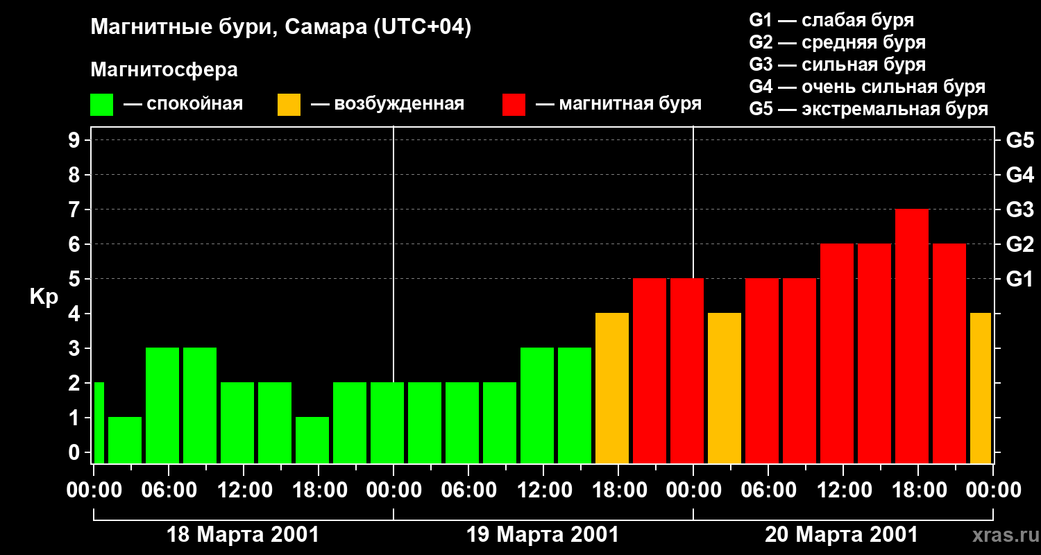 Изменения геомагнитного индекса Kp с 18 по 20 марта 2001 года для средних широт