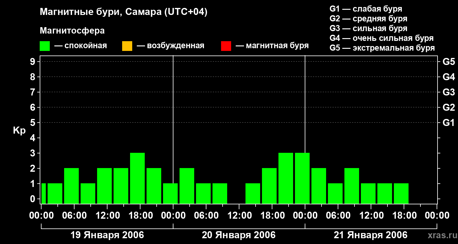 Изменения геомагнитного индекса Kp с 19 по 21 января 2006 года для средних широт