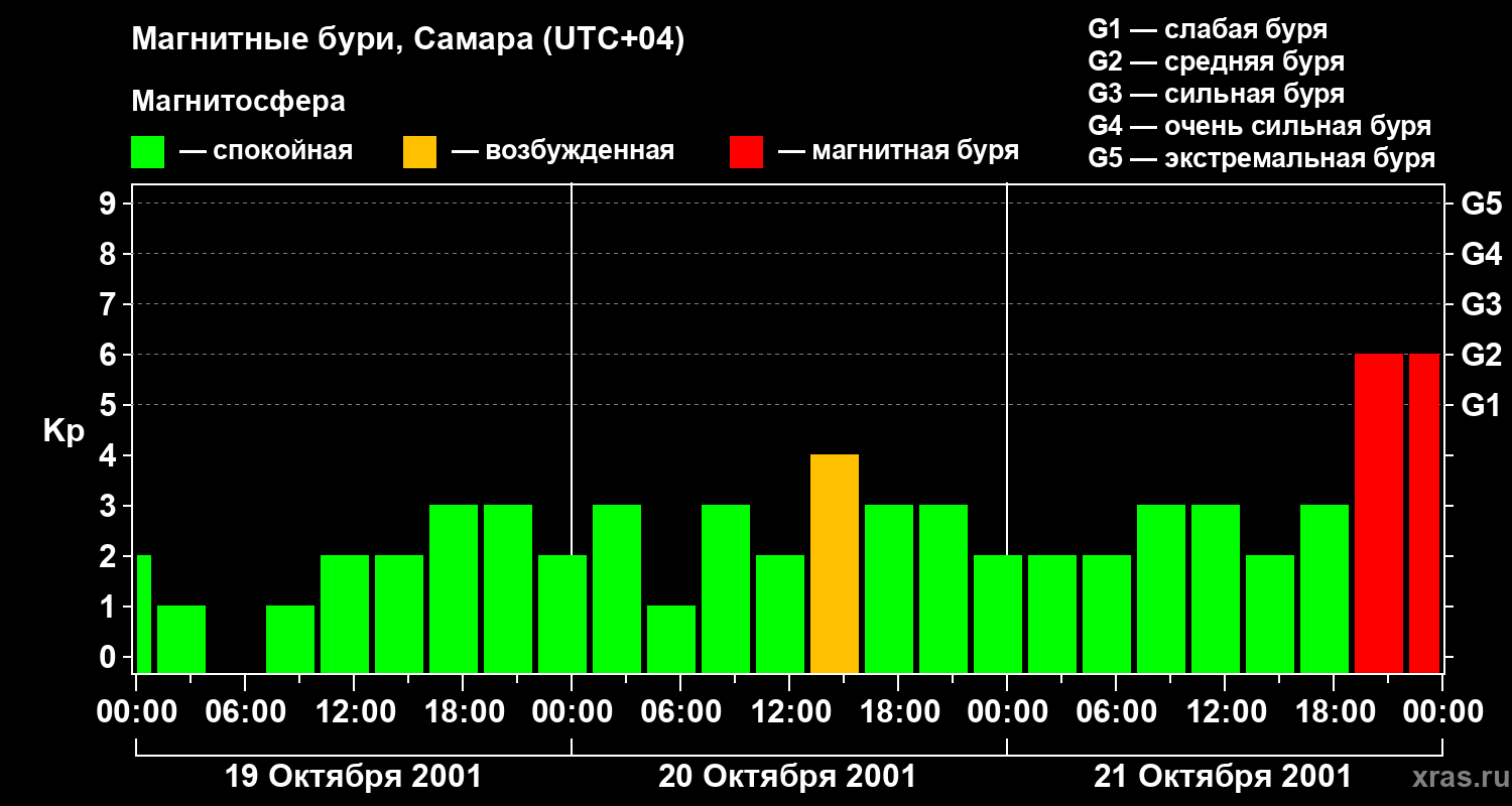 Изменения геомагнитного индекса Kp с 19 по 21 октября 2001 года для средних широт