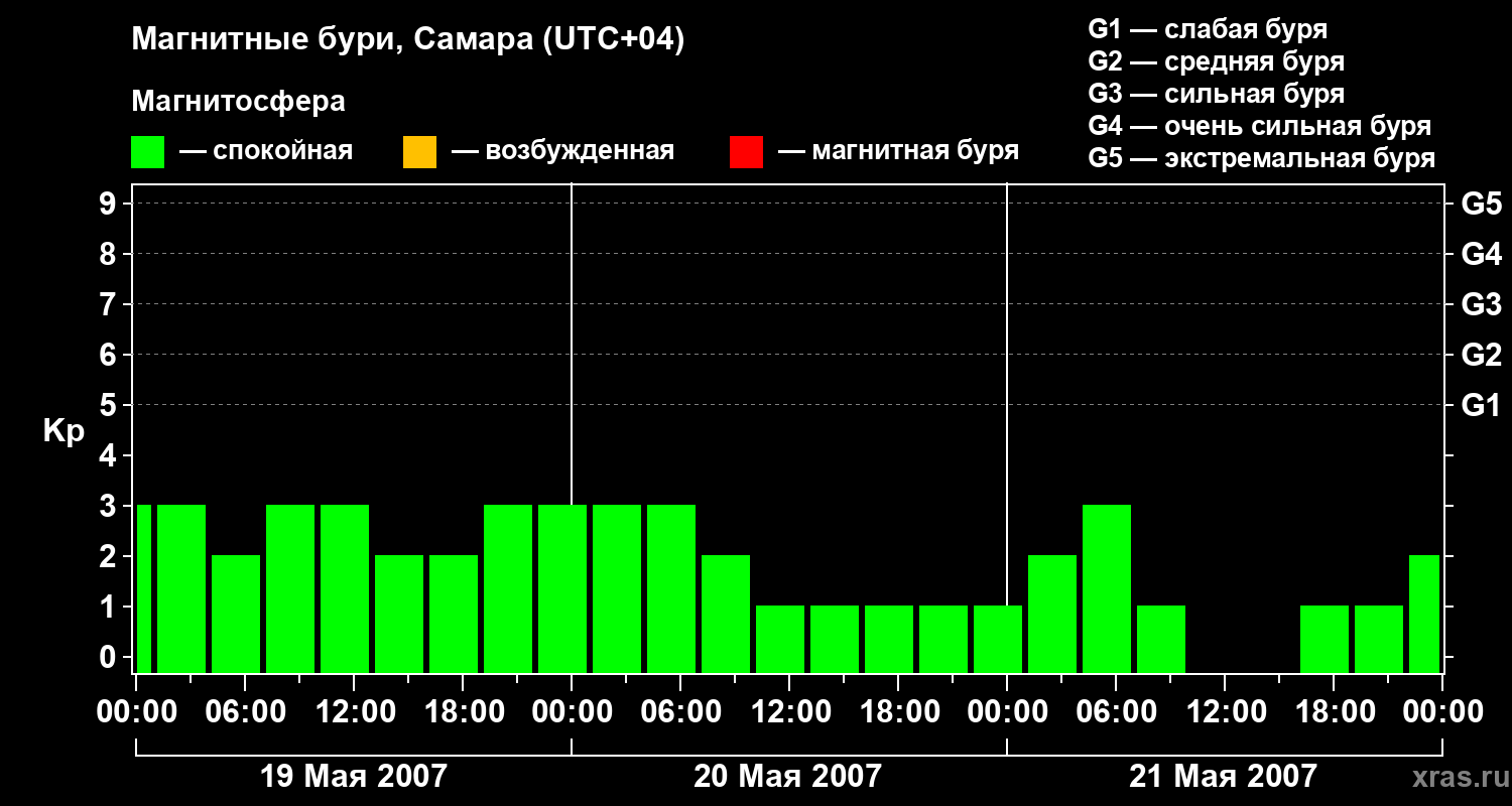 Изменения геомагнитного индекса Kp с 19 по 21 мая 2007 года для средних широт