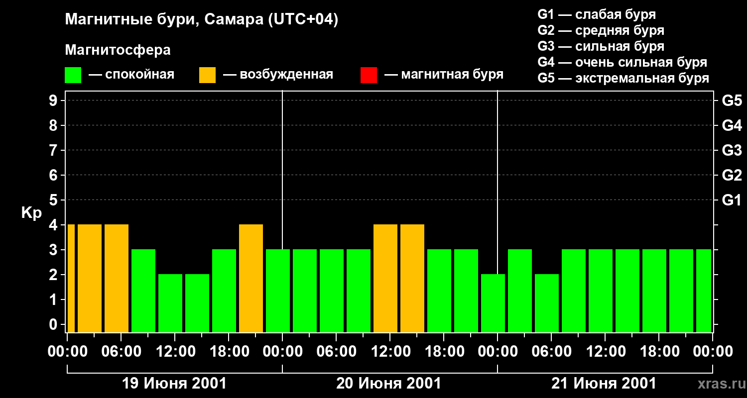 Изменения геомагнитного индекса Kp с 19 по 21 июня 2001 года для средних широт