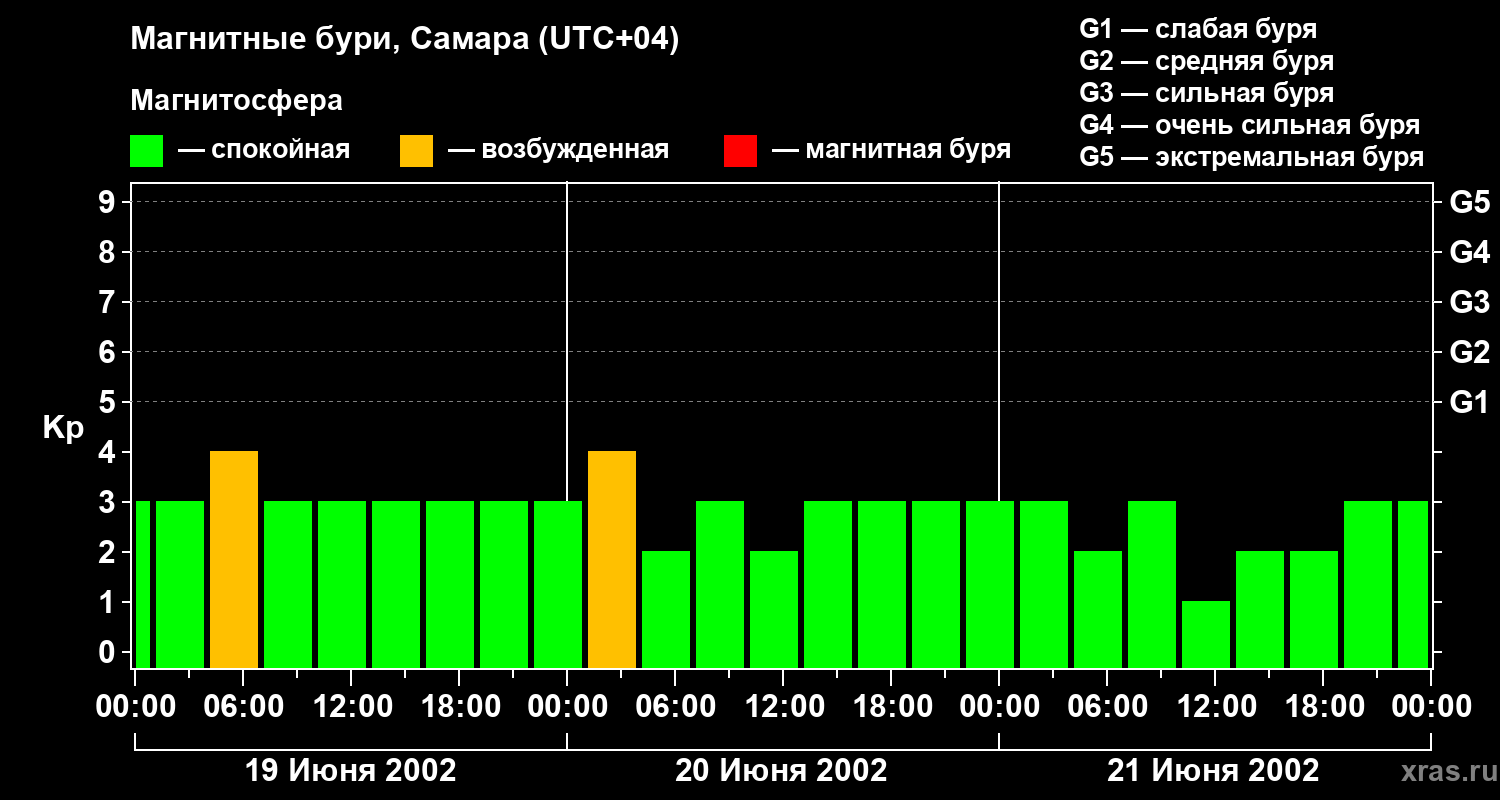 Изменения геомагнитного индекса Kp с 19 по 21 июня 2002 года для средних широт