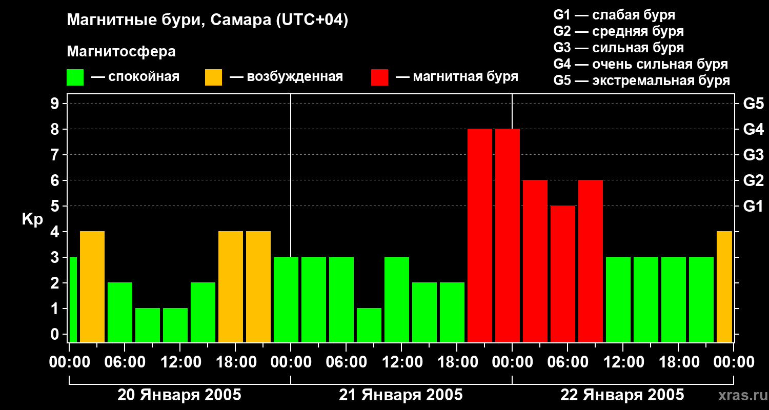 Изменения геомагнитного индекса Kp с 20 по 22 января 2005 года для средних широт