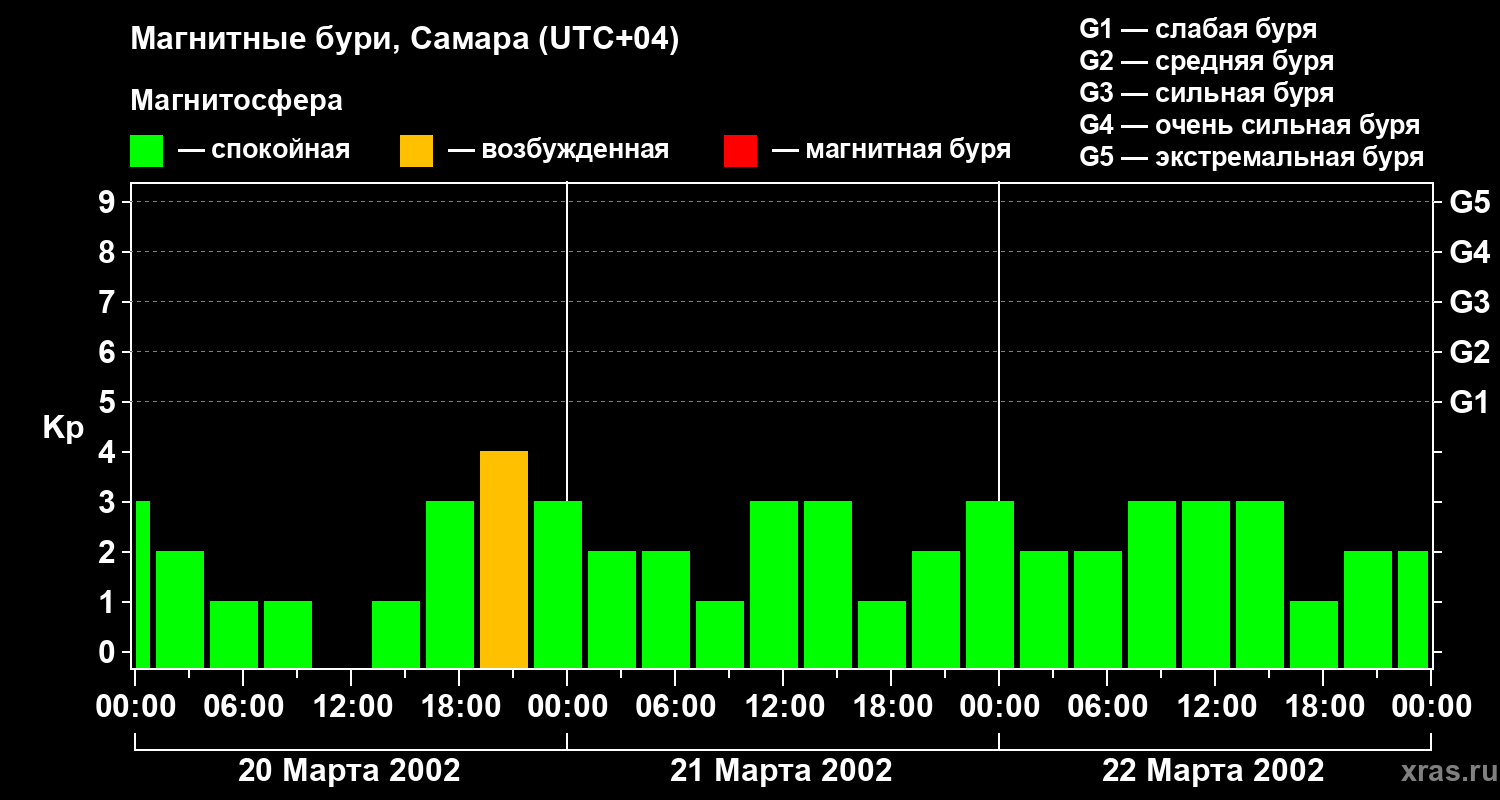 Изменения геомагнитного индекса Kp с 20 по 22 марта 2002 года для средних широт