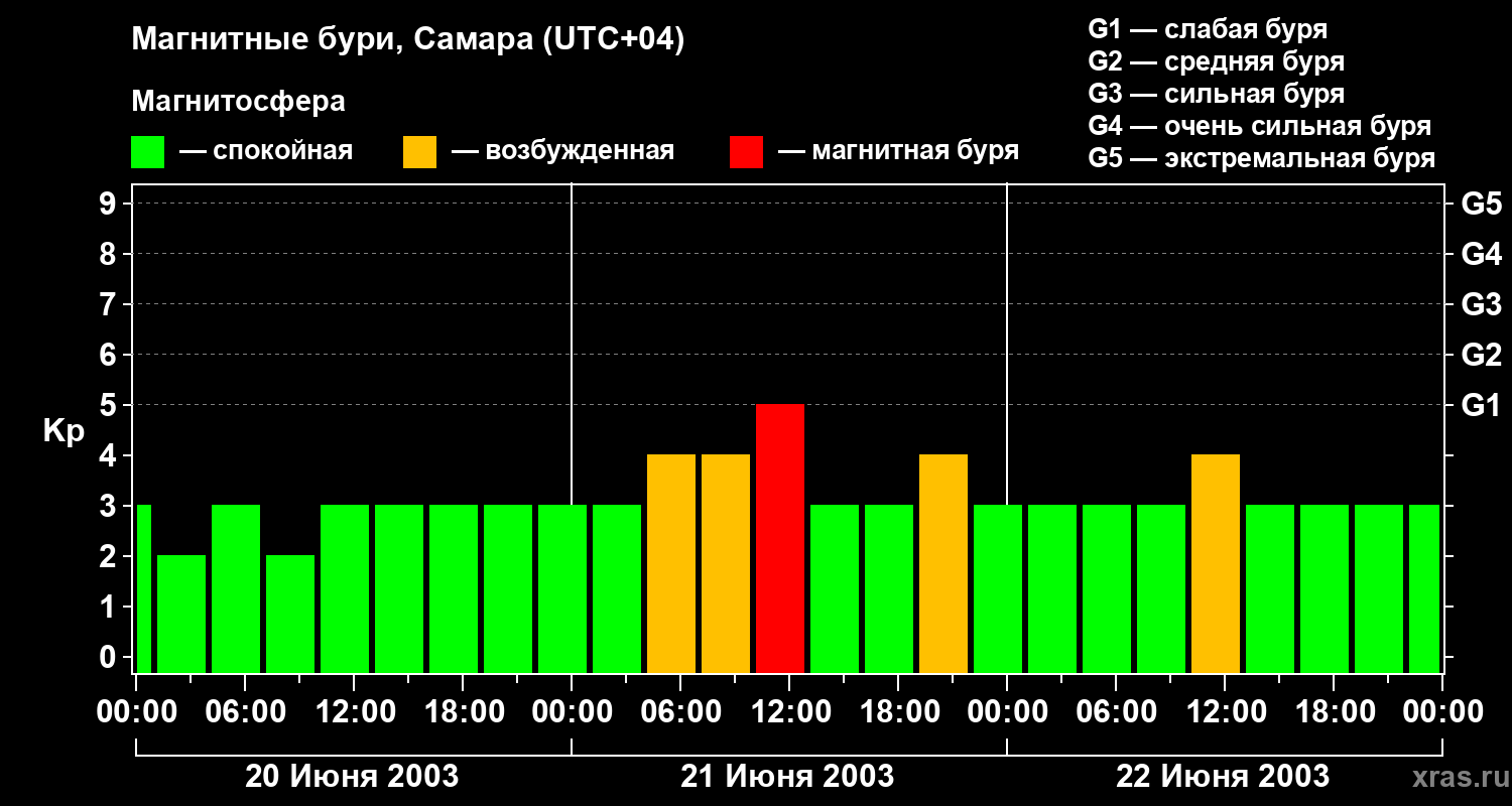 Изменения геомагнитного индекса Kp с 20 по 22 июня 2003 года для средних широт