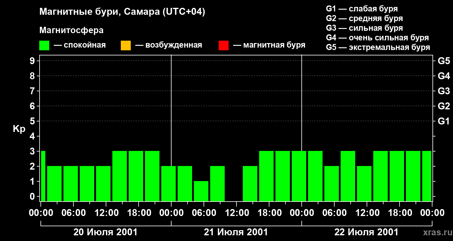 Изменения геомагнитного индекса Kp с 20 по 22 июля 2001 года для средних широт
