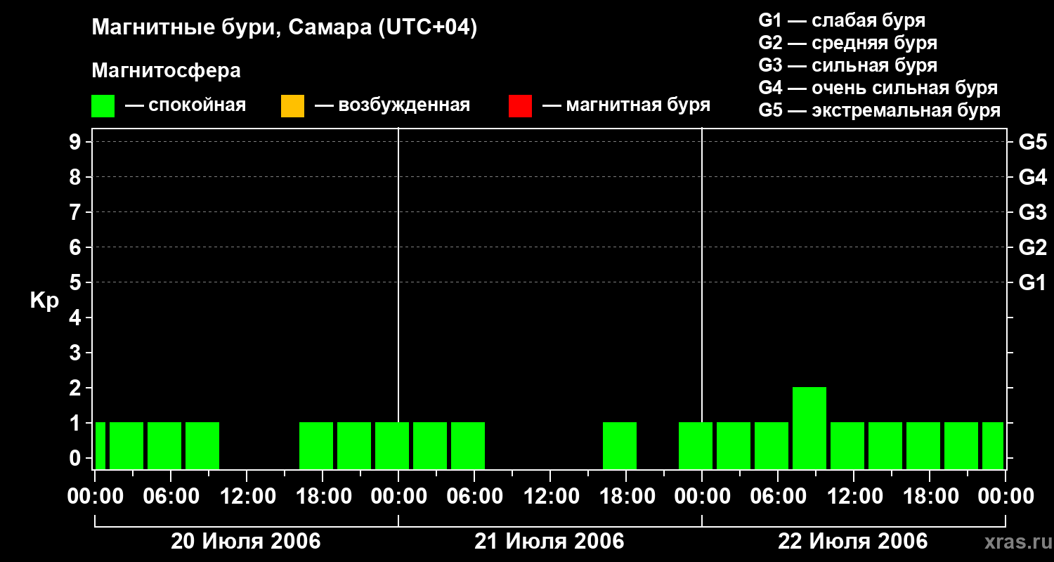 Изменения геомагнитного индекса Kp с 20 по 22 июля 2006 года для средних широт