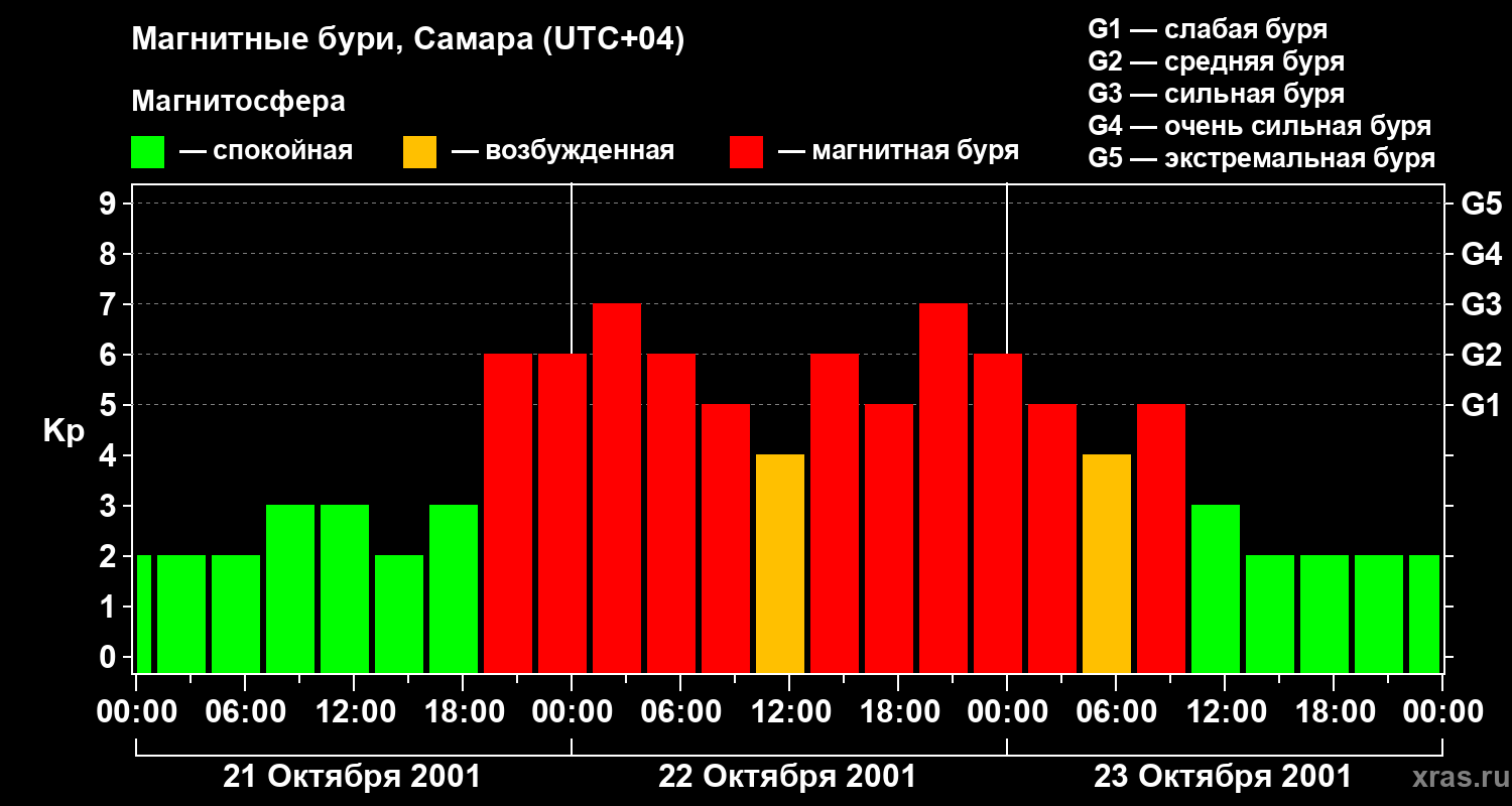 Изменения геомагнитного индекса Kp с 21 по 23 октября 2001 года для средних широт