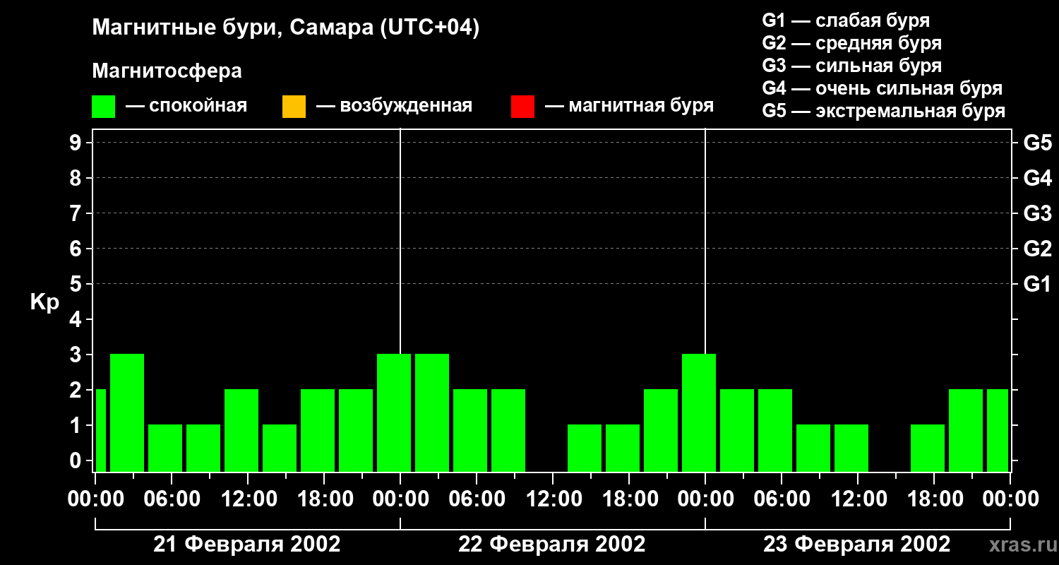 Изменения геомагнитного индекса Kp с 21 по 23 февраля 2002 года для средних широт