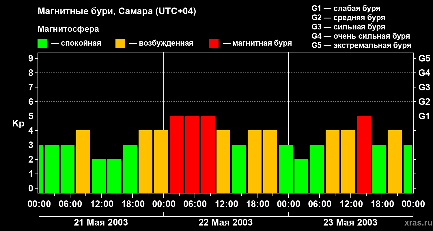 Изменения геомагнитного индекса Kp с 21 по 23 мая 2003 года для средних широт
