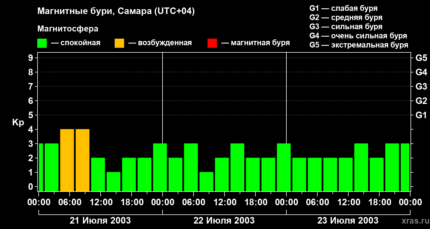 Изменения геомагнитного индекса Kp с 21 по 23 июля 2003 года для средних широт