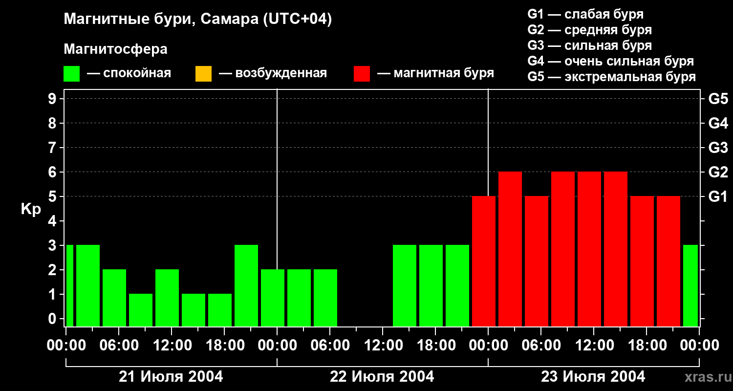 Изменения геомагнитного индекса Kp с 21 по 23 июля 2004 года для средних широт