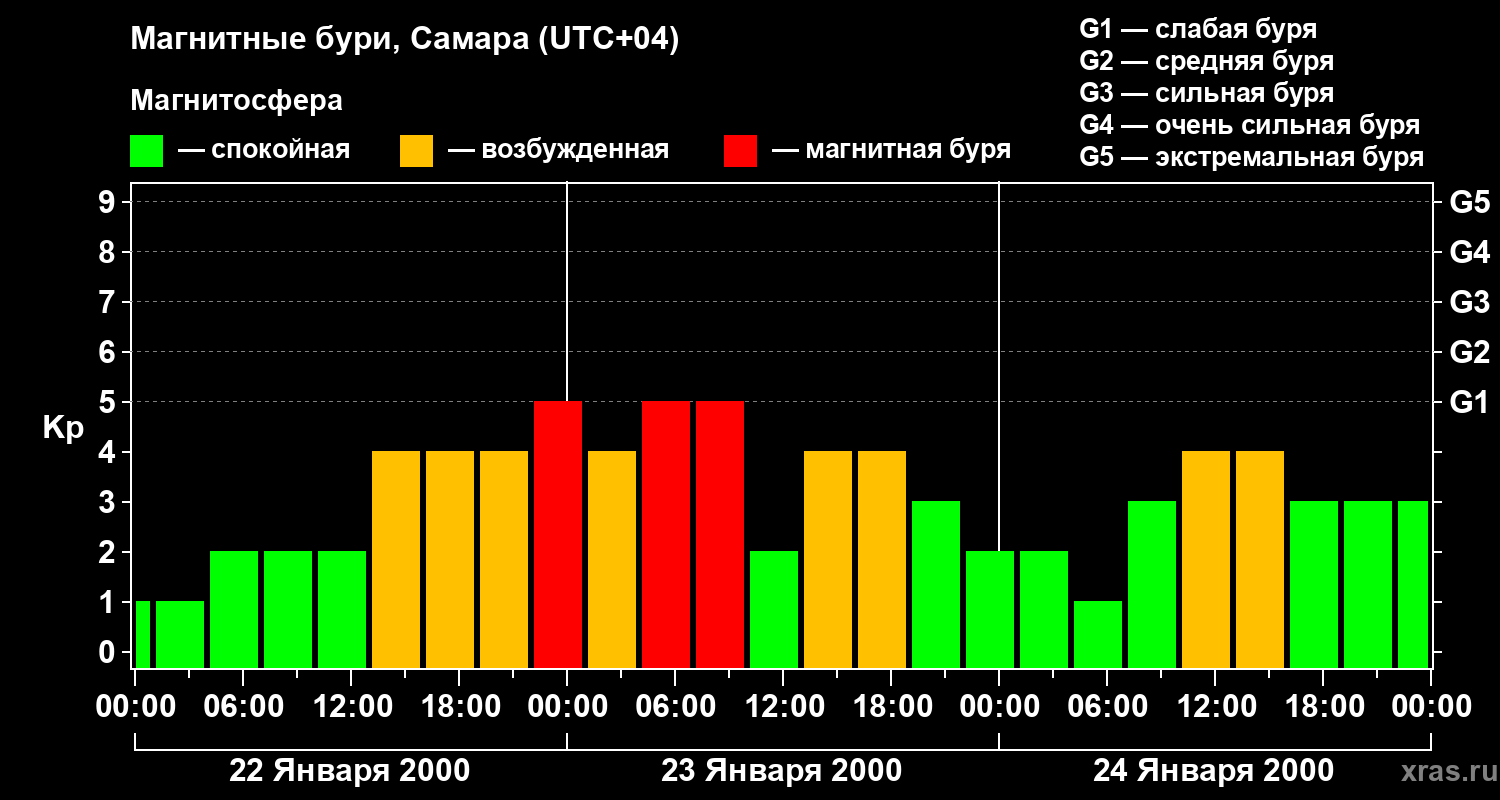 Изменения геомагнитного индекса Kp с 22 по 24 января 2000 года для средних широт