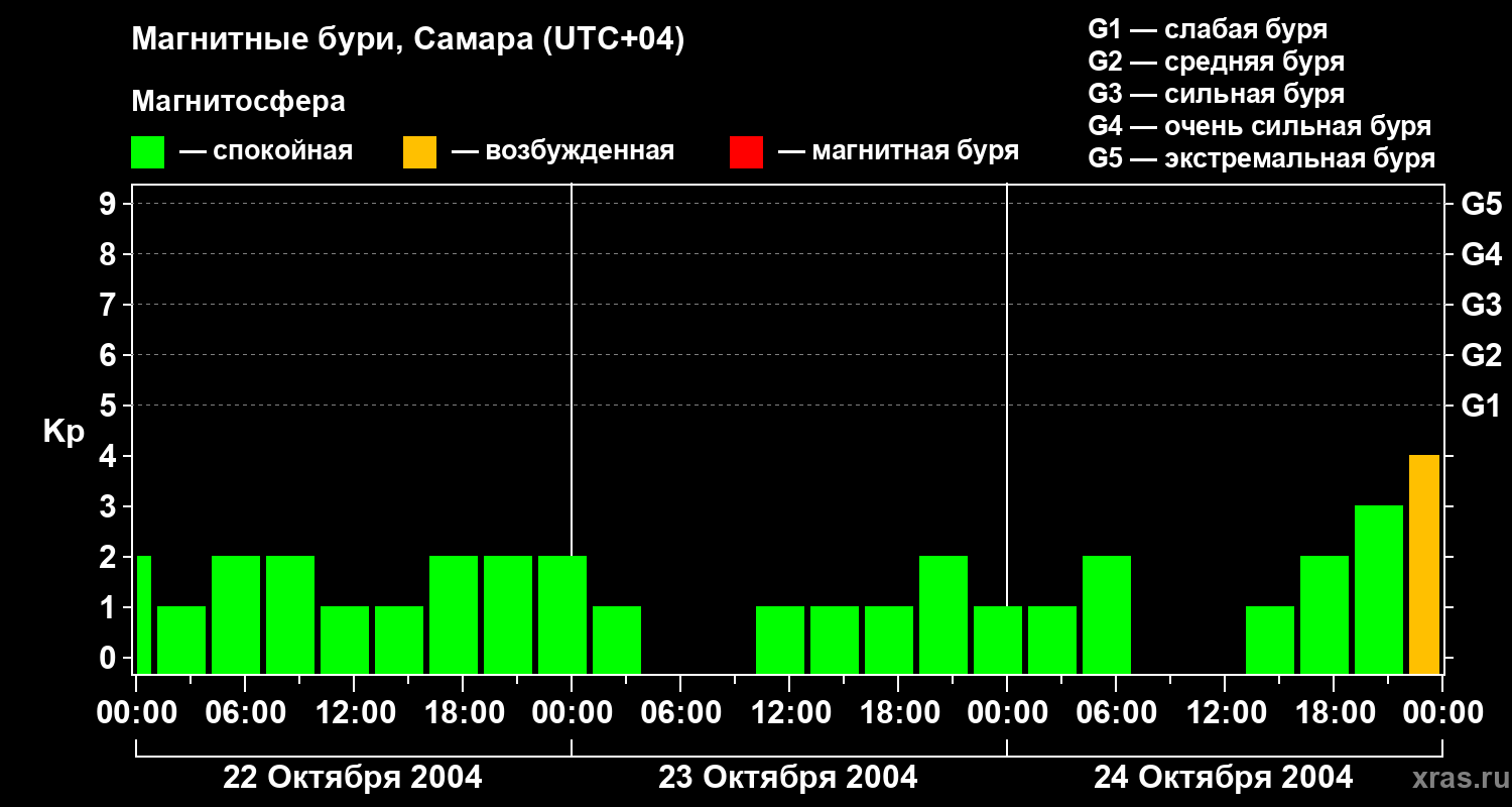 Изменения геомагнитного индекса Kp с 22 по 24 октября 2004 года для средних широт
