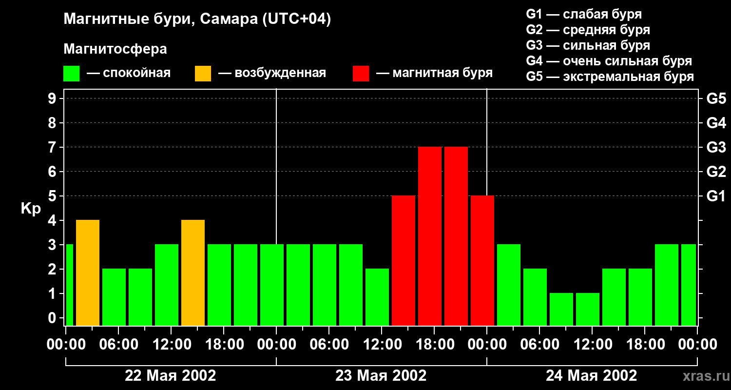 Изменения геомагнитного индекса Kp с 22 по 24 мая 2002 года для средних широт
