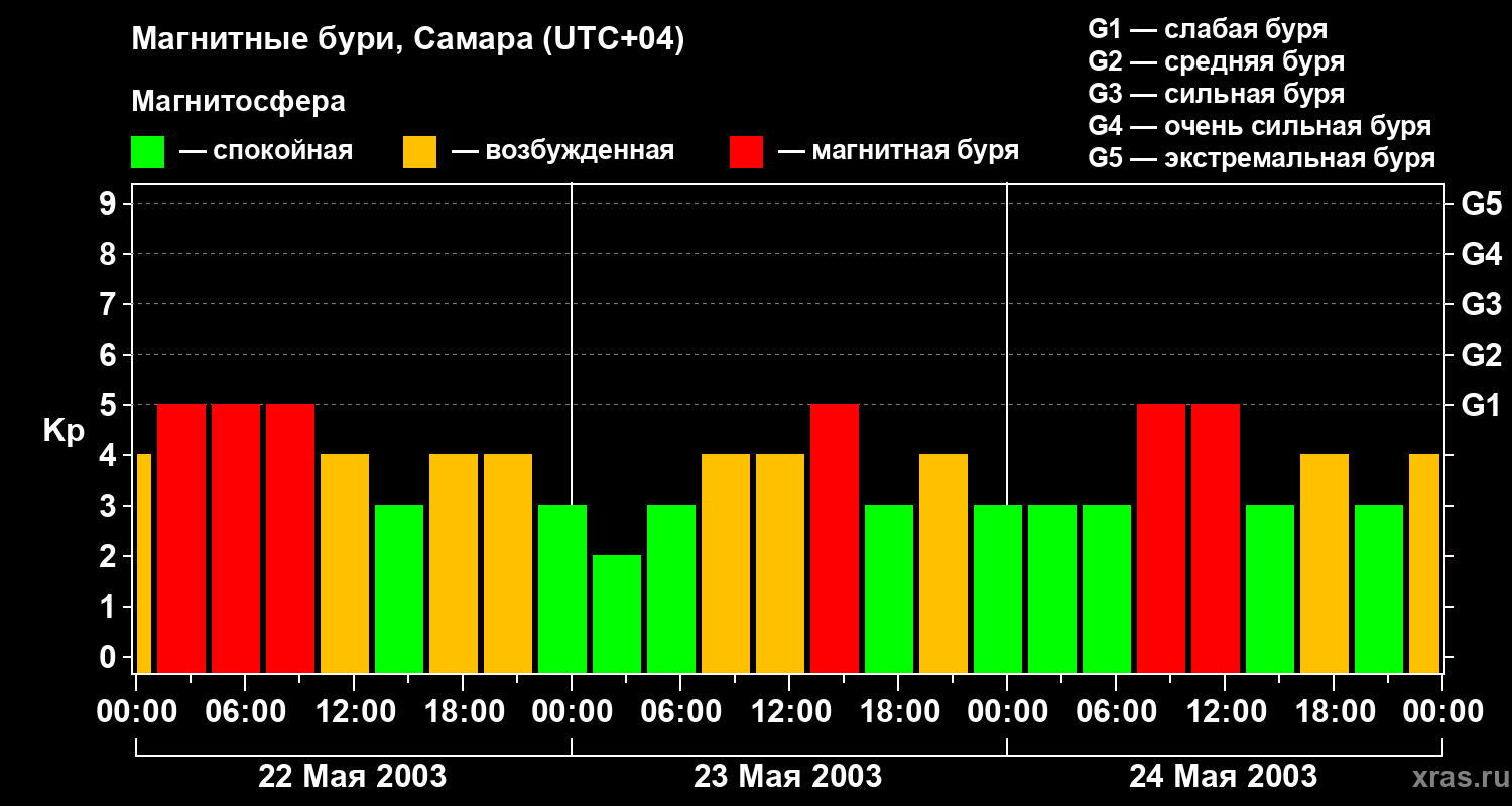 Изменения геомагнитного индекса Kp с 22 по 24 мая 2003 года для средних широт