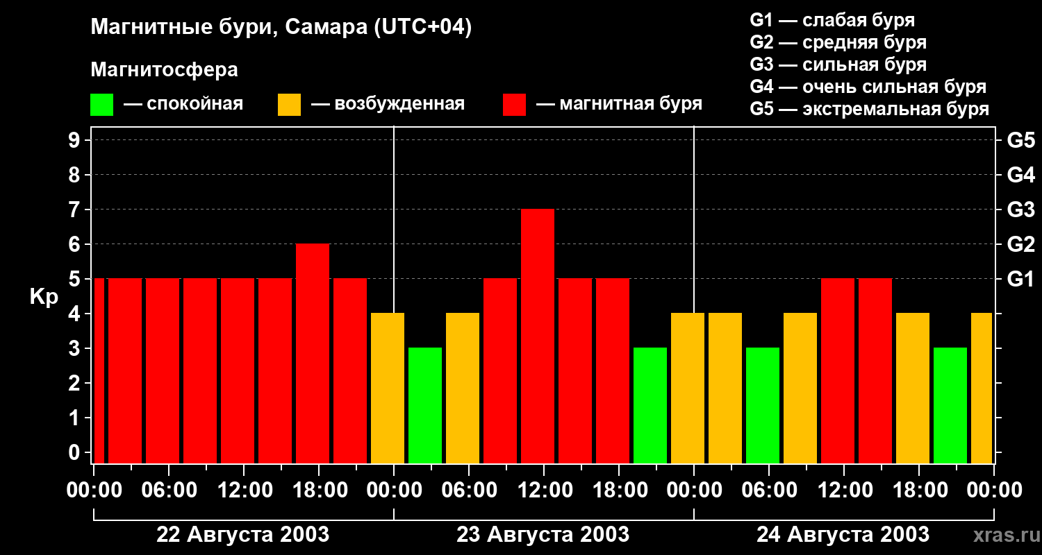 Изменения геомагнитного индекса Kp с 22 по 24 августа 2003 года для средних широт