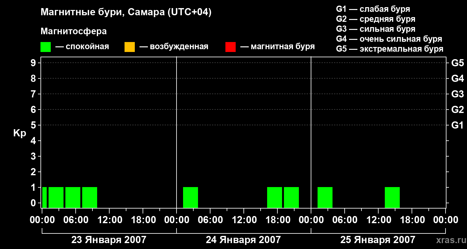 Изменения геомагнитного индекса Kp с 23 по 25 января 2007 года для средних широт