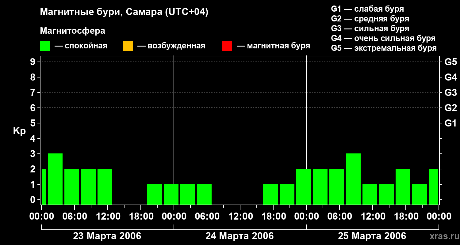 Изменения геомагнитного индекса Kp с 23 по 25 марта 2006 года для средних широт