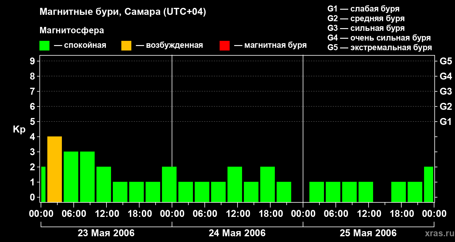 Изменения геомагнитного индекса Kp с 23 по 25 мая 2006 года для средних широт