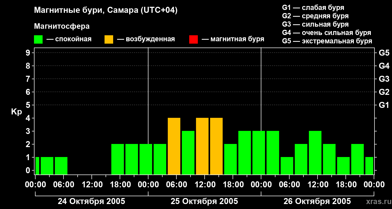 Изменения геомагнитного индекса Kp с 24 по 26 октября 2005 года для средних широт