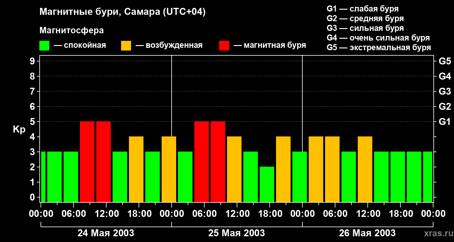 Изменения геомагнитного индекса Kp с 24 по 26 мая 2003 года для средних широт