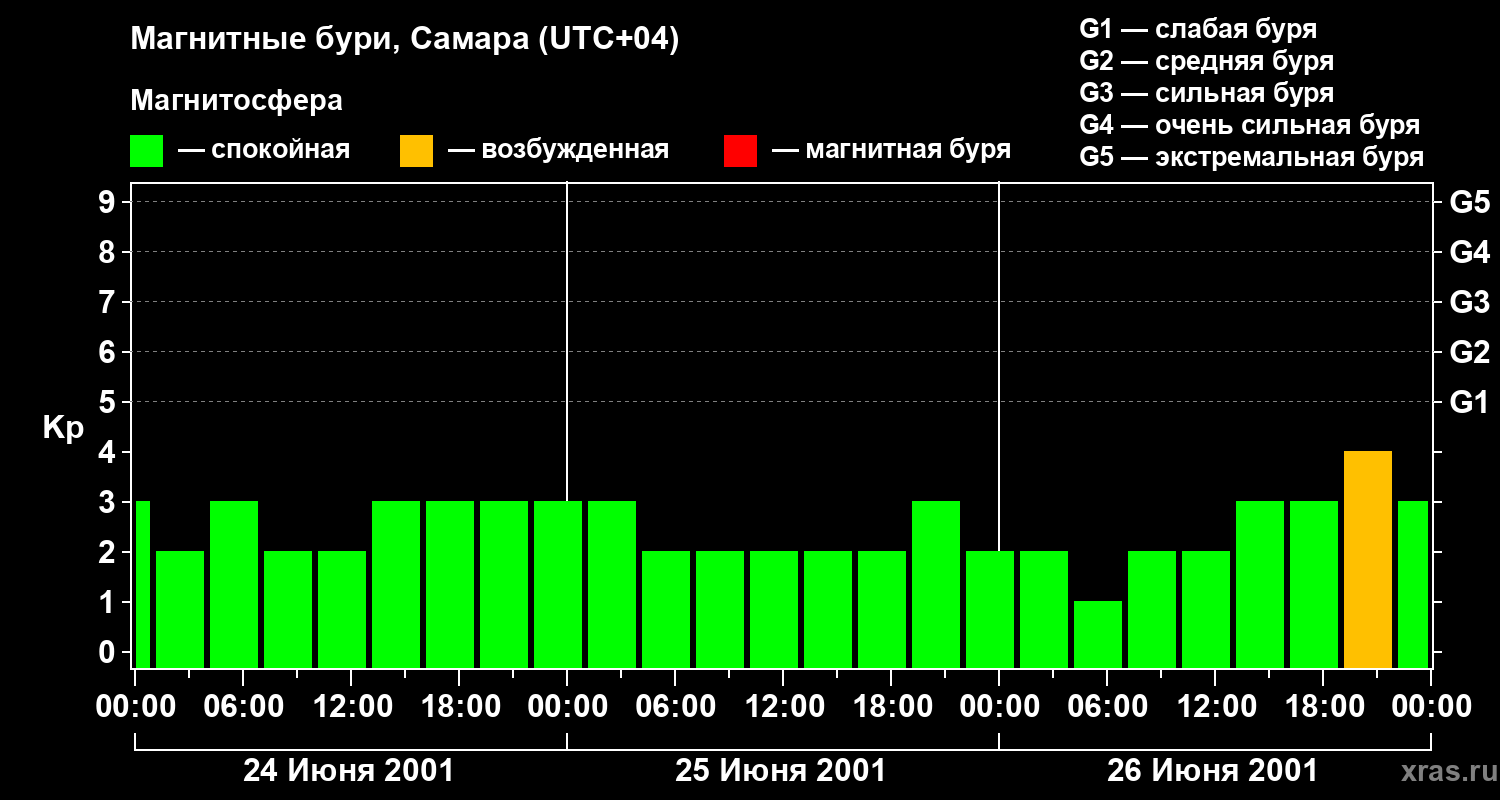 Изменения геомагнитного индекса Kp с 24 по 26 июня 2001 года для средних широт