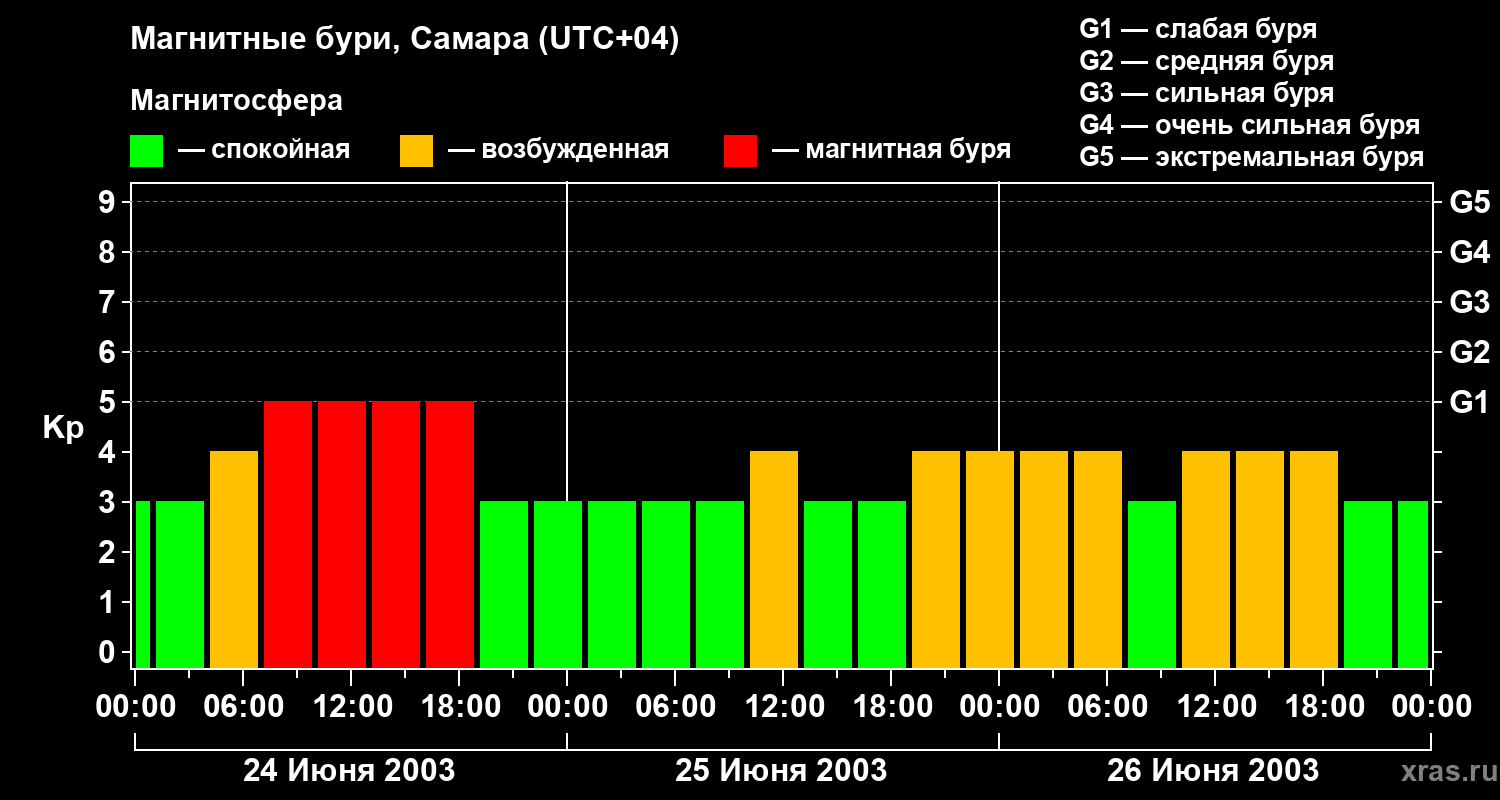 Изменения геомагнитного индекса Kp с 24 по 26 июня 2003 года для средних широт