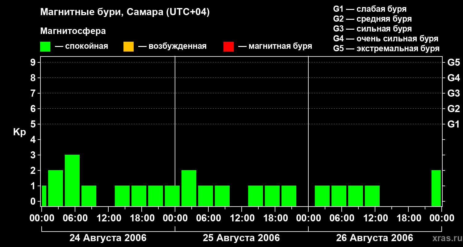Изменения геомагнитного индекса Kp с 24 по 26 августа 2006 года для средних широт