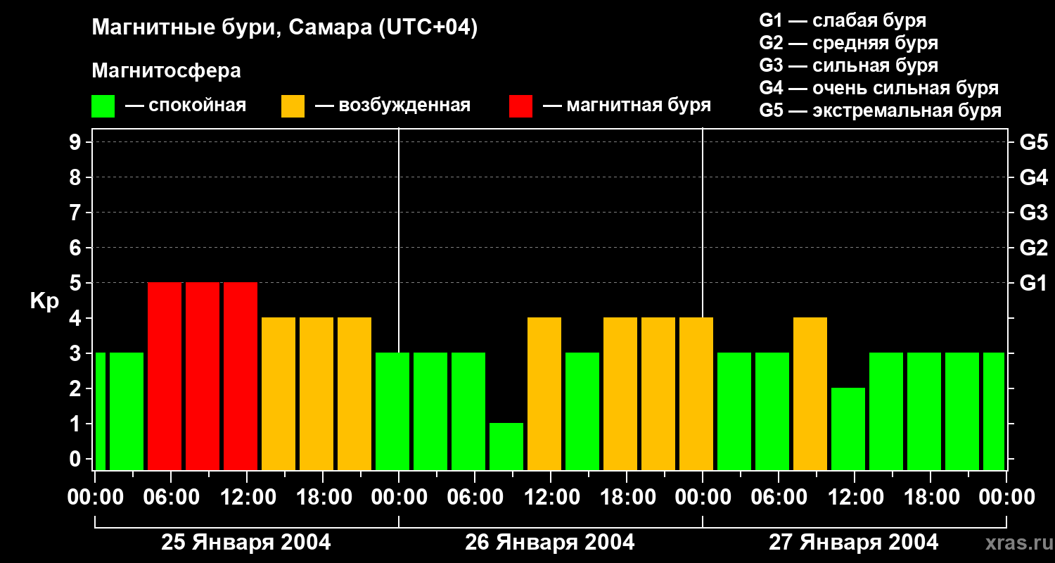 Изменения геомагнитного индекса Kp с 25 по 27 января 2004 года для средних широт