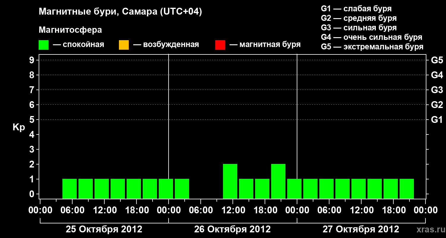 Изменения геомагнитного индекса Kp с 25 по 27 октября 2012 года для средних широт