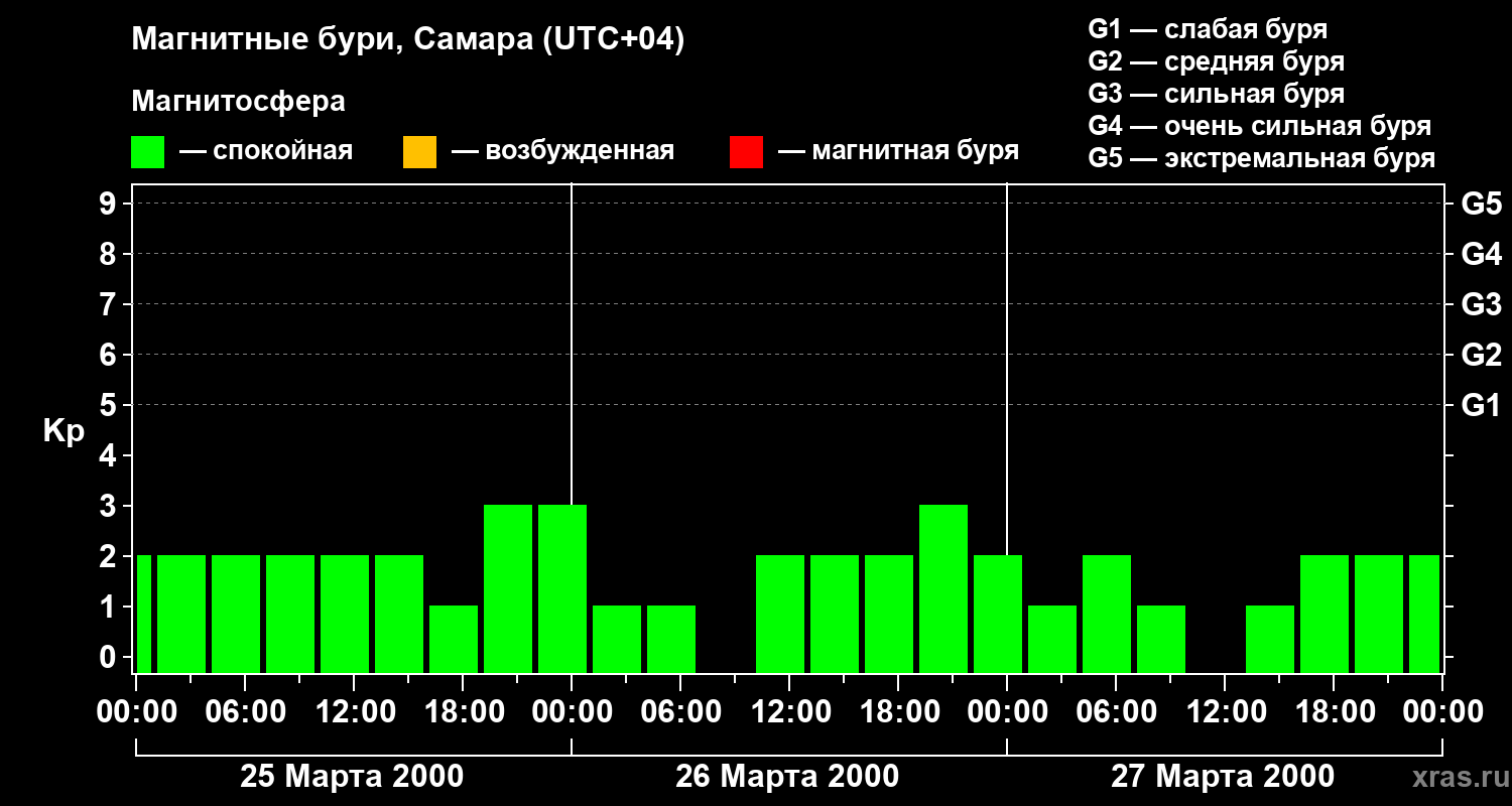 Изменения геомагнитного индекса Kp с 25 по 27 марта 2000 года для средних широт