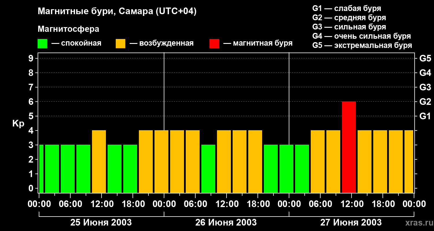 Изменения геомагнитного индекса Kp с 25 по 27 июня 2003 года для средних широт