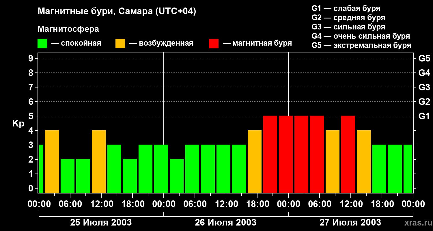 Изменения геомагнитного индекса Kp с 25 по 27 июля 2003 года для средних широт
