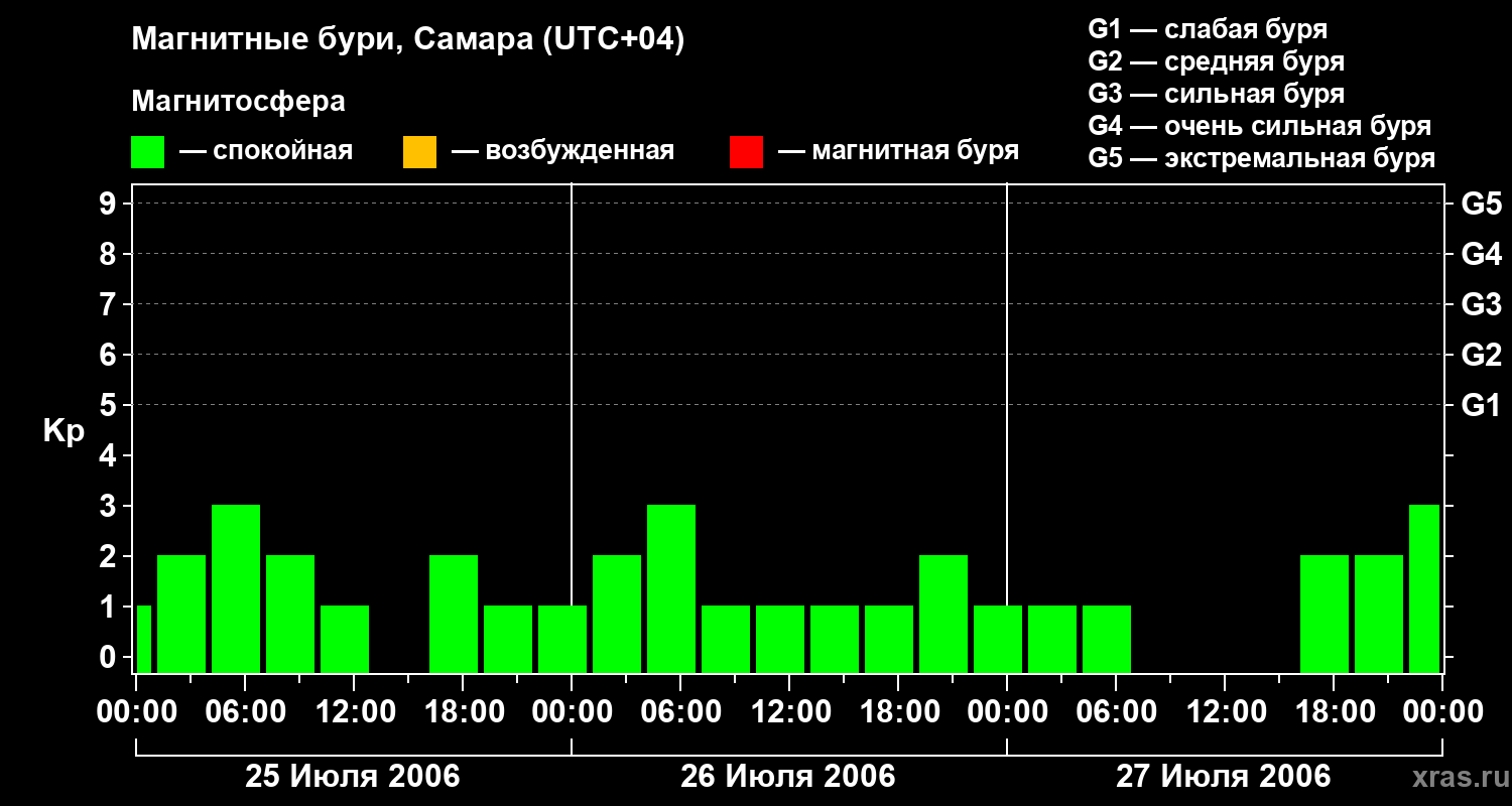 Изменения геомагнитного индекса Kp с 25 по 27 июля 2006 года для средних широт